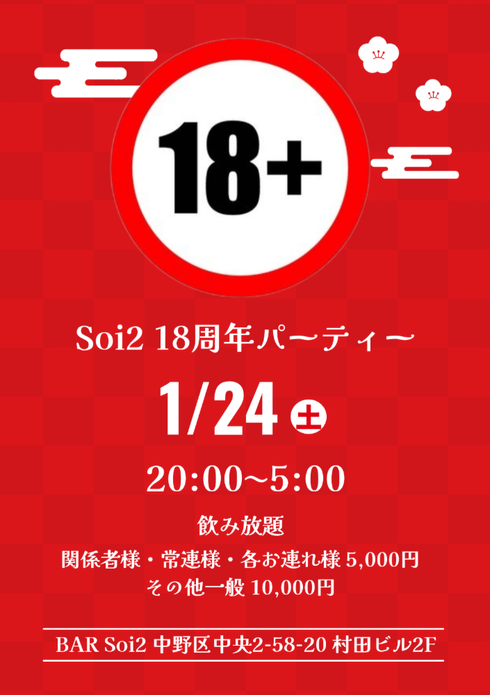 | 営業時間 | 月 19〜2:00(Soiギリ) 火~木 20〜3:00 金 20〜5:00(Soi➀) 土祝前日 21〜7:00 日祝日 20〜3:00 ✻急遽時間変更あり |
